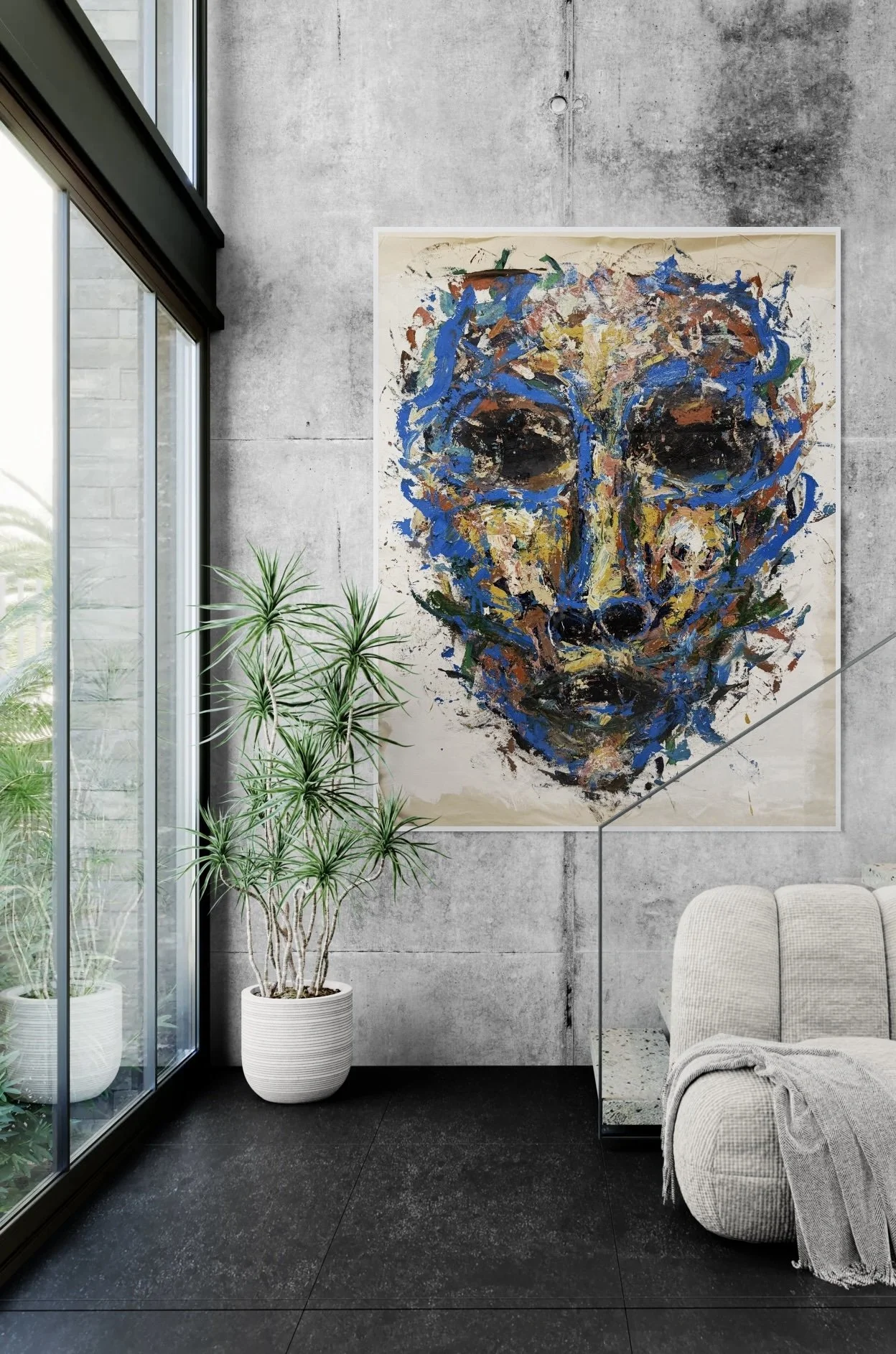 Confronting the viewer with unrestrained energy, this piece is built from bold, thick layers of oil applied in instinctive moments. Blues slice through reds and earth tones like ruptures in the psyche, while shadows anchor the composition in tension and ambiguity.