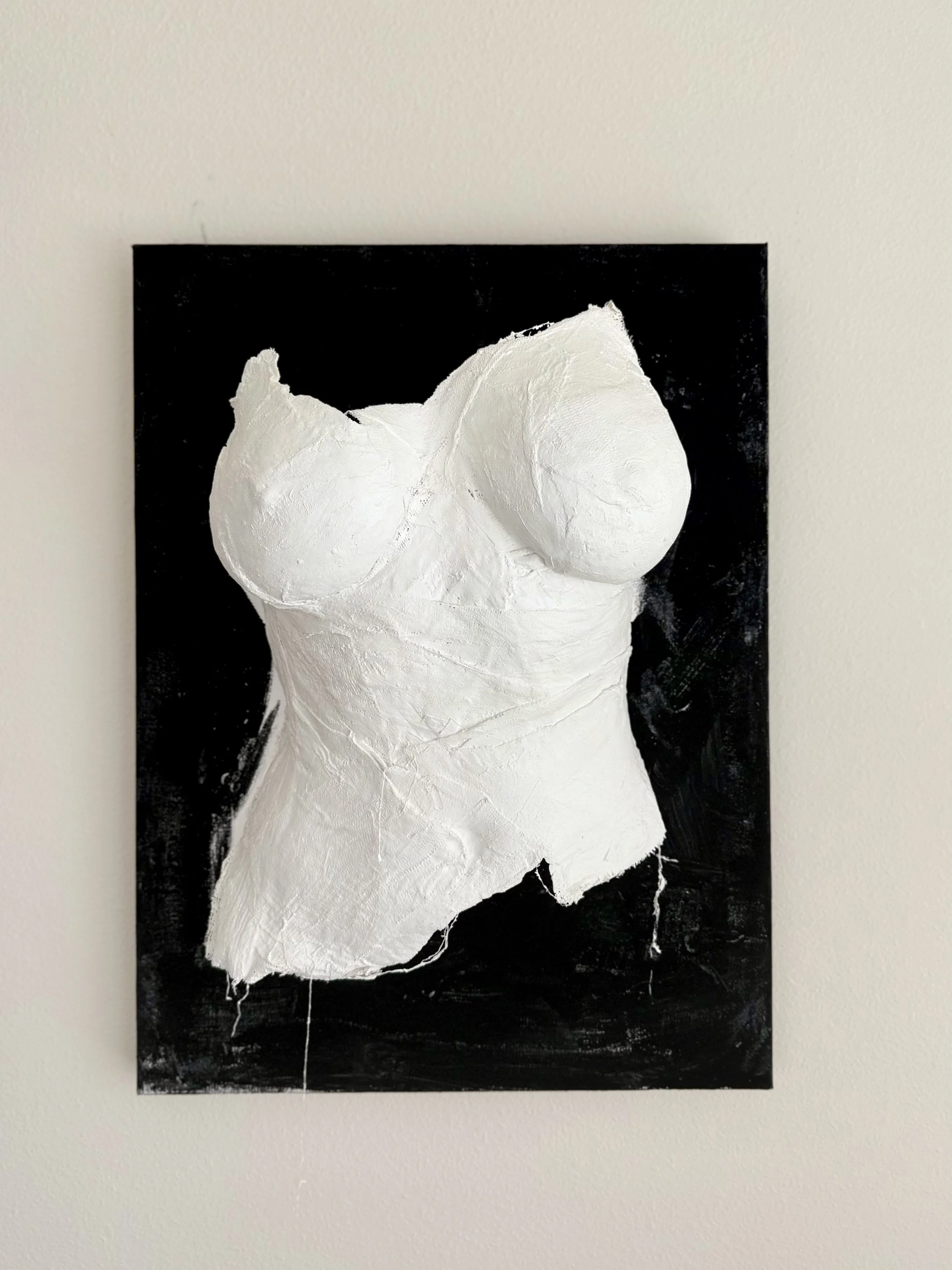 “Sculpted: Bare” captures the body in a moment of stillness - unfiltered, textured, and exposed. Cast directly from the form in real time, it holds the shape of breath, skin, and pause. The surface remains intentionally imperfect, with raw plaster and black pigment creating a quiet contrast between presence and absence. This piece honors the physical imprint of vulnerability and the quiet strength of being held.